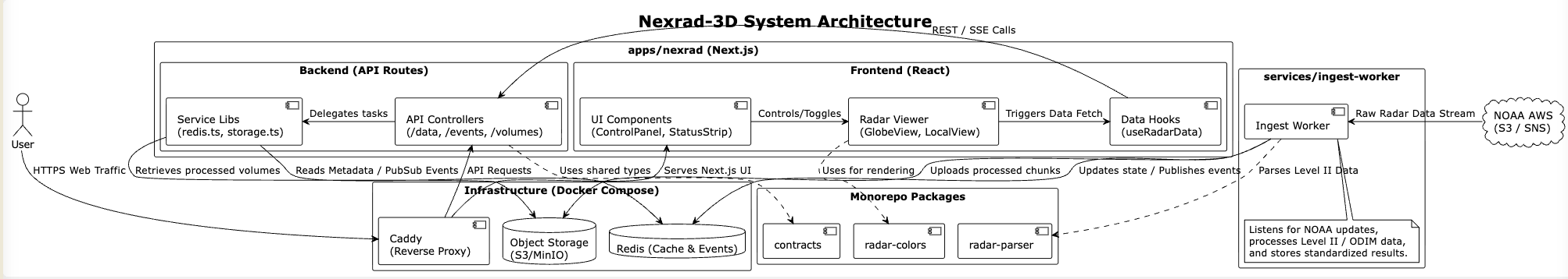 Solution: I developed Nexrad 3D, a monorepo web platform that provides a 3D globe experience, near-real-time radar updates, and radar-source switching. It features a Next.js frontend with custom MapLibre globe and local volume ray-march renderers, accompanied by a backend ingest worker that polls upstream radar manifests. I also built specialized TypeScript packages to parse NEXRAD Level 2 and ODIM H5 radar formats directly.