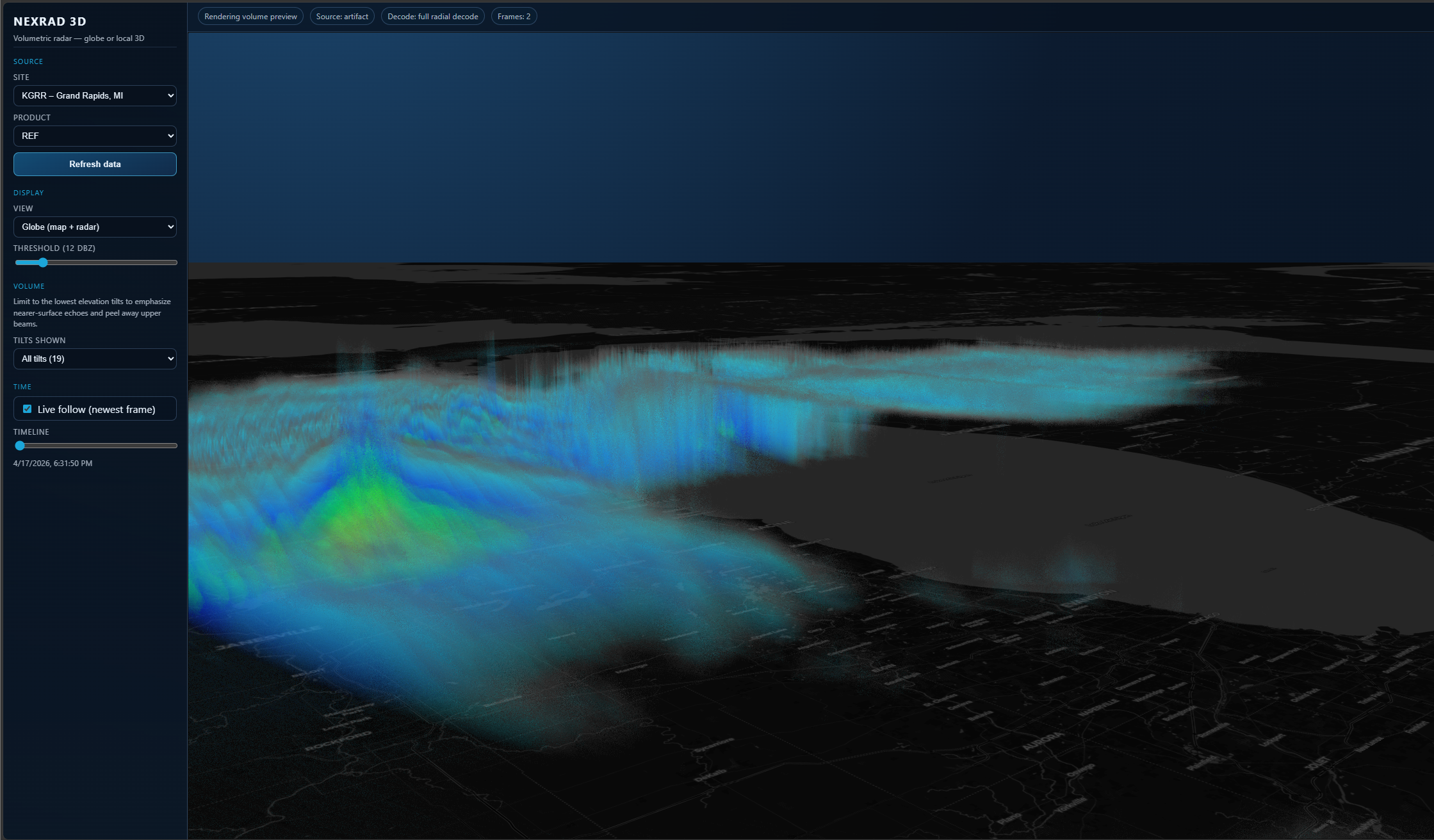 Problem Statement: I wanted to create a modern, web-native 3D globe experience for visualizing volumetric weather radar data. Existing radar visualization tools are often desktop-only or lack true 3D volumetric rendering in the browser with near-real-time updates.