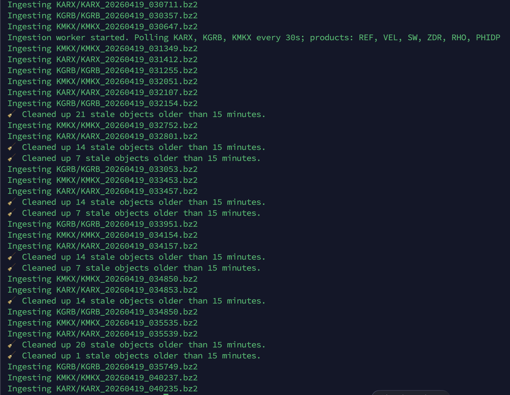 Set up a backend ingest worker to poll upstream radar manifests and publish readiness events using Redis, with MinIO for local object storage emulation. Everything was tied together using Docker Compose for easy local development and full-stack deployment.
