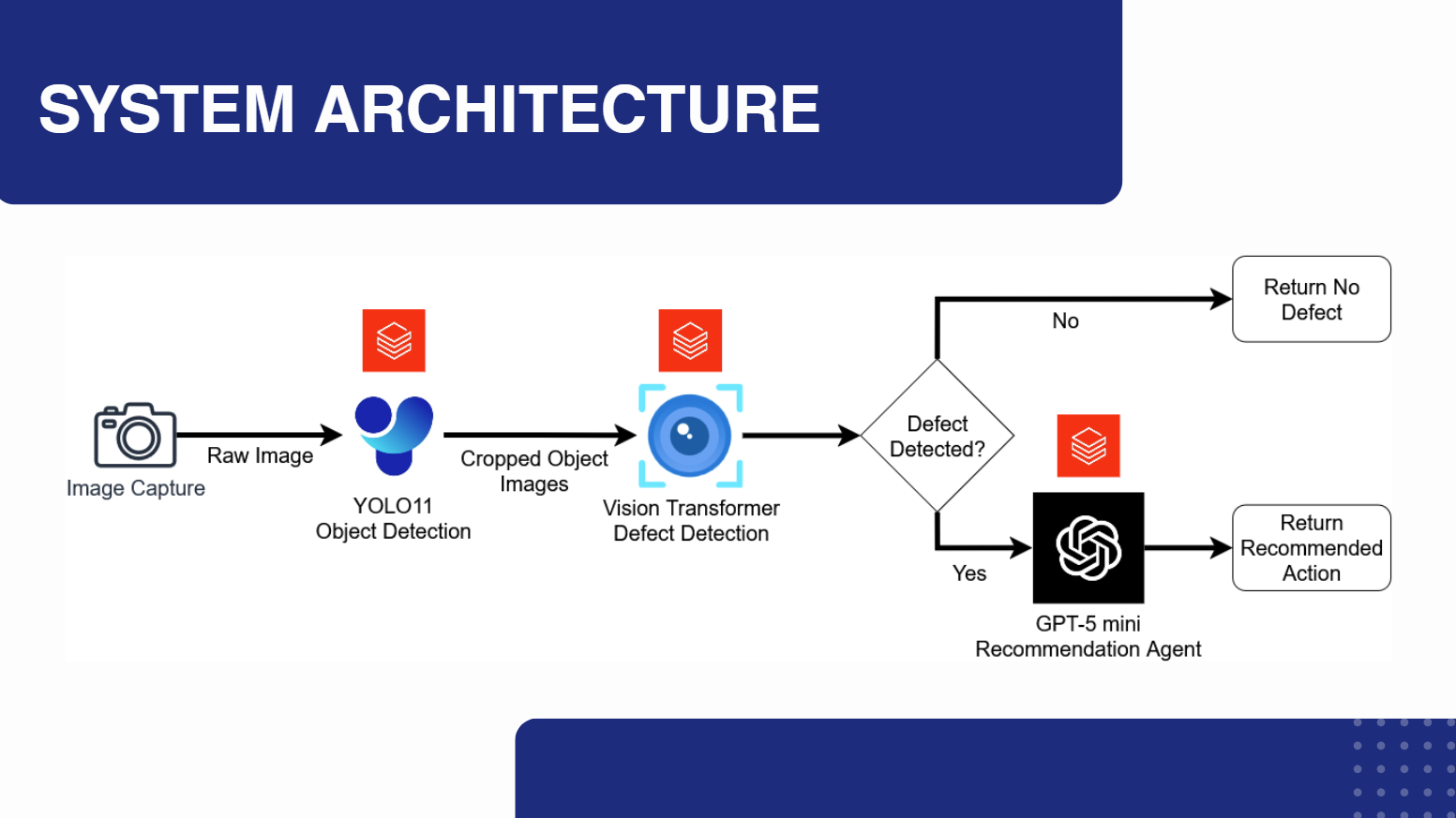 The AI pipeline was a crucial part of the application. We used YOLO v11 to crop products out of the overall image, then we passed those product images to a custom Vision Transformer trained on the Kapput Dataset. When a defect was detected, we passed the VIT output to a custom GPT 5 mini agent to make the final decision on how to proceed.