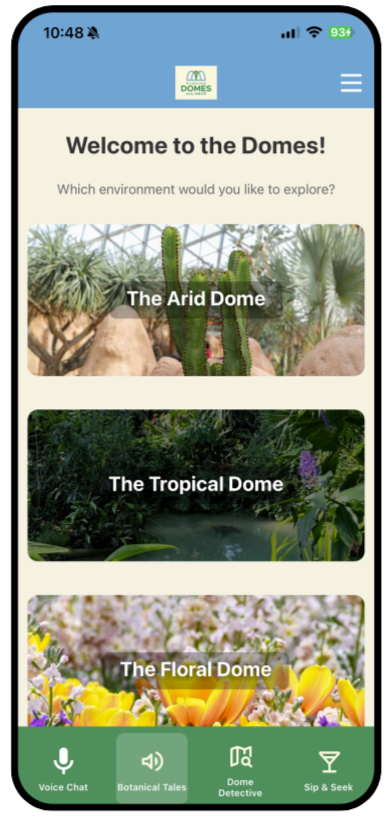 Solution: My team created a mobile application using React Native and Expo that leverages Bluetooth Low Energy (BLE) beacons to deliver location-based information and experiences to visitors. The app includes features such as Dome Detectives—an interactive scavenger hunt that encourages exploration and learning about plants and exhibits. It also includes Botanical Tales, audio stories that provide historical context about plants and exhibits, paced by the user's location via the BLE beacons. A partnership feature, Sip & Seek, allows visitors to purchase drinks from the Domes café and receive an audio tour related to the plant ingredients used in the beverages. The app also includes a chat feature that lets visitors ask questions and receive answers from an AI-powered chatbot. For accessibility, the app offers text-to-speech, adjustable font sizes, and support for 10 languages.