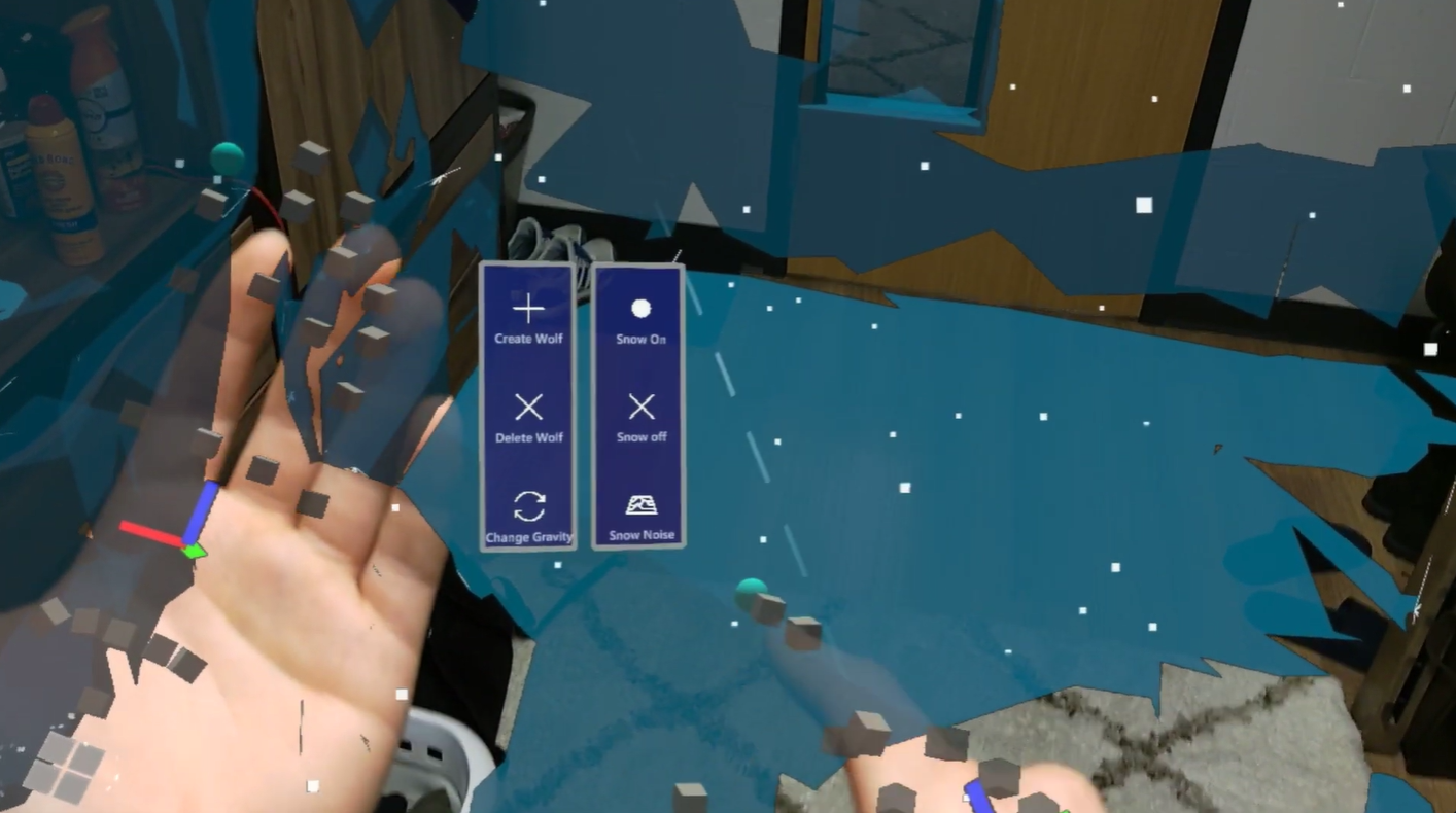 Solution: I built a HoloLens 2 tech demo using MRTK2 and Microsoft Scene Understanding to generate a real‑world floor mesh which was converted into a runtime nav mesh. Users spawn winter‑themed wolves that obey gravity and randomly roam the mesh. A hand menu toggles snowfall particle systems, adjusts wind strength influencing snow drift, and spawns additional wolves. The project won 1st place for its innovative use of spatial understanding and intuitive hand‑tracked controls without peripherals.